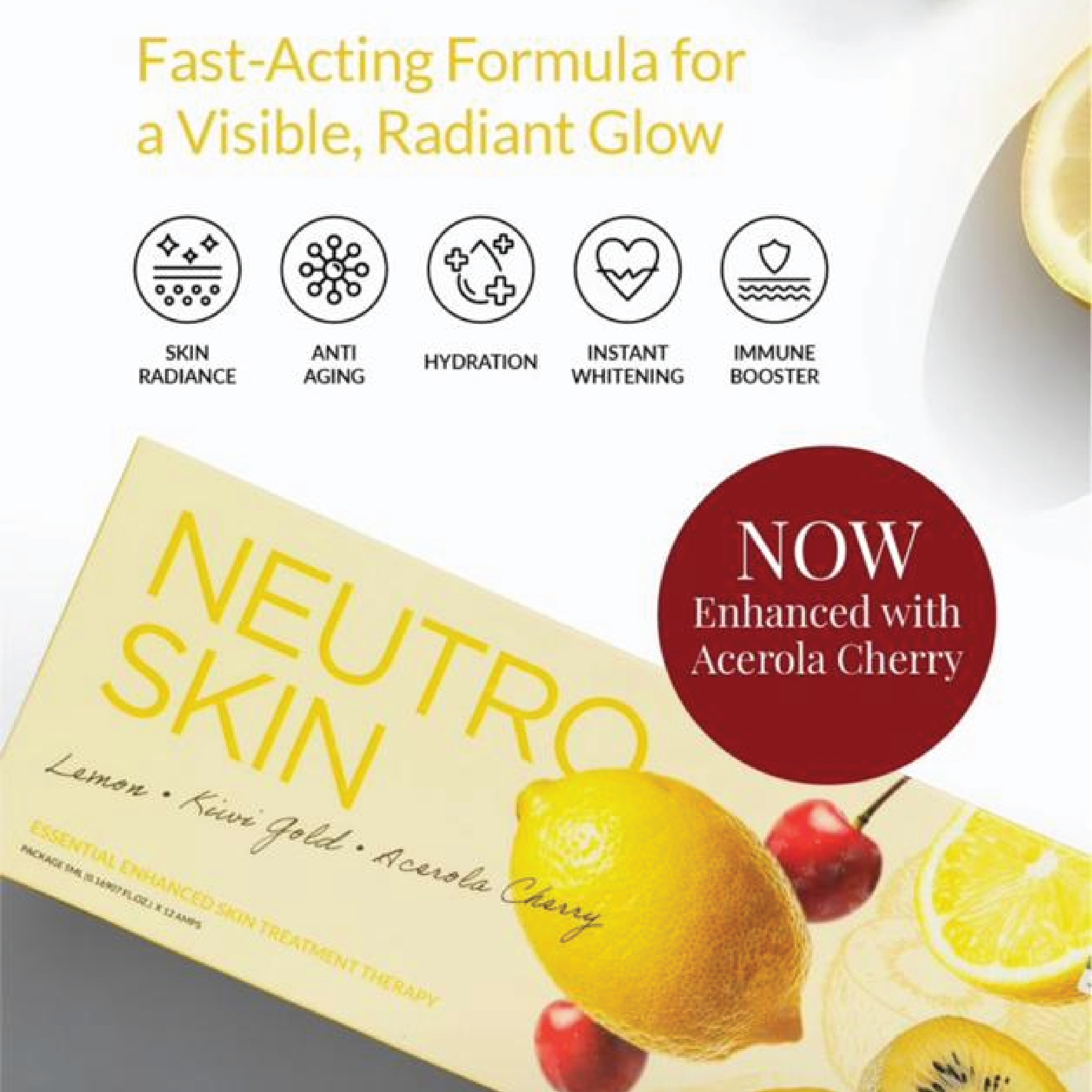 Conclusion: Neutro Skin Lemon, Kiwi Gold, Avocado & Cherry Enhanced Skin Treatment Therapy [10 Sessions] is a total skin-rejuvenating solution combining brightening, hydrating, and anti-aging benefits in one powerful formula. The blend of lemon, kiwi gold, avocado, and cherry extracts works synergistically to deliver a whiter, smoother, firmer, and more radiant complexion. Perfect for those seeking advanced skin enhancement with visible results, this enhanced skin treatment therapy offers long-lasting glow, nourishment, and youthful transformation.