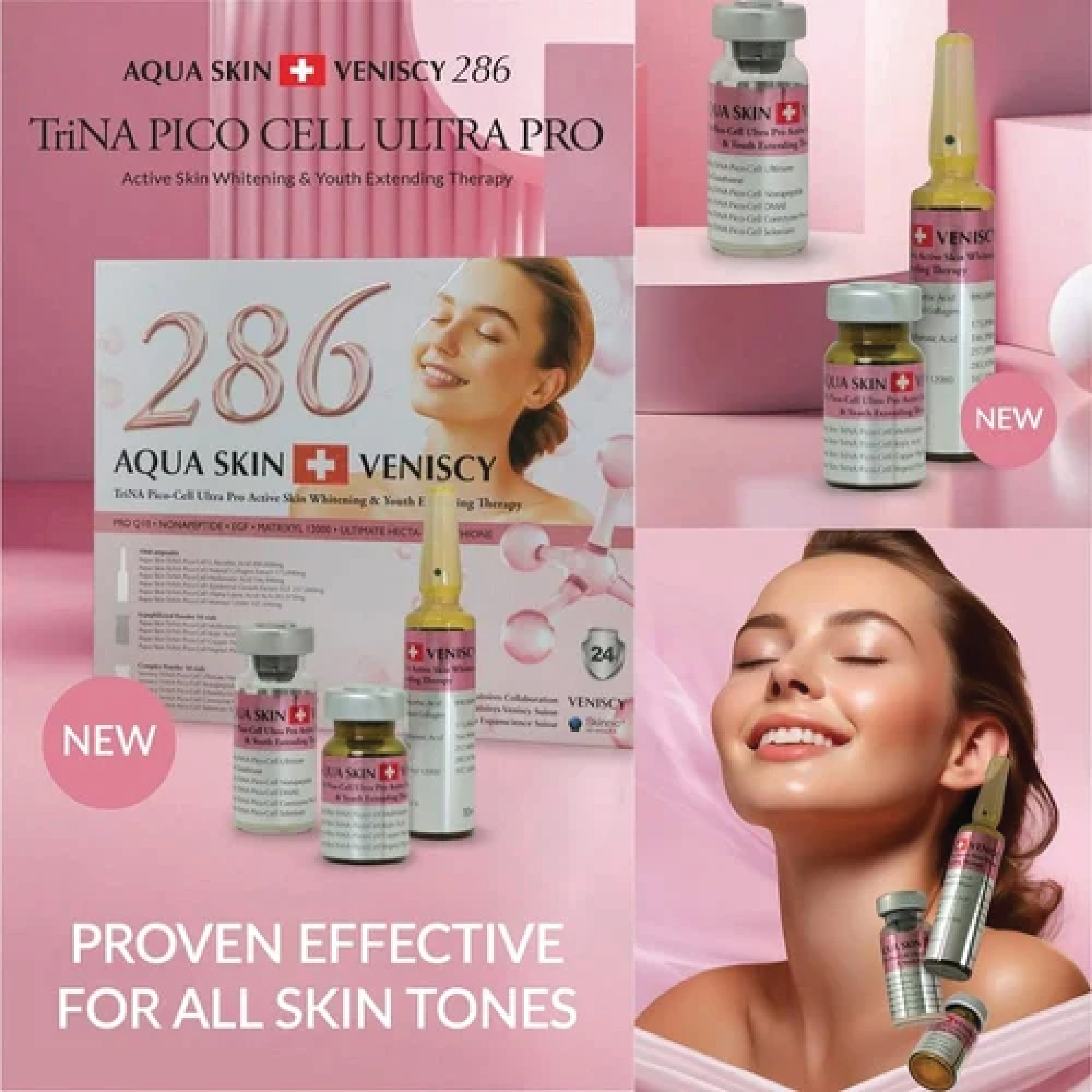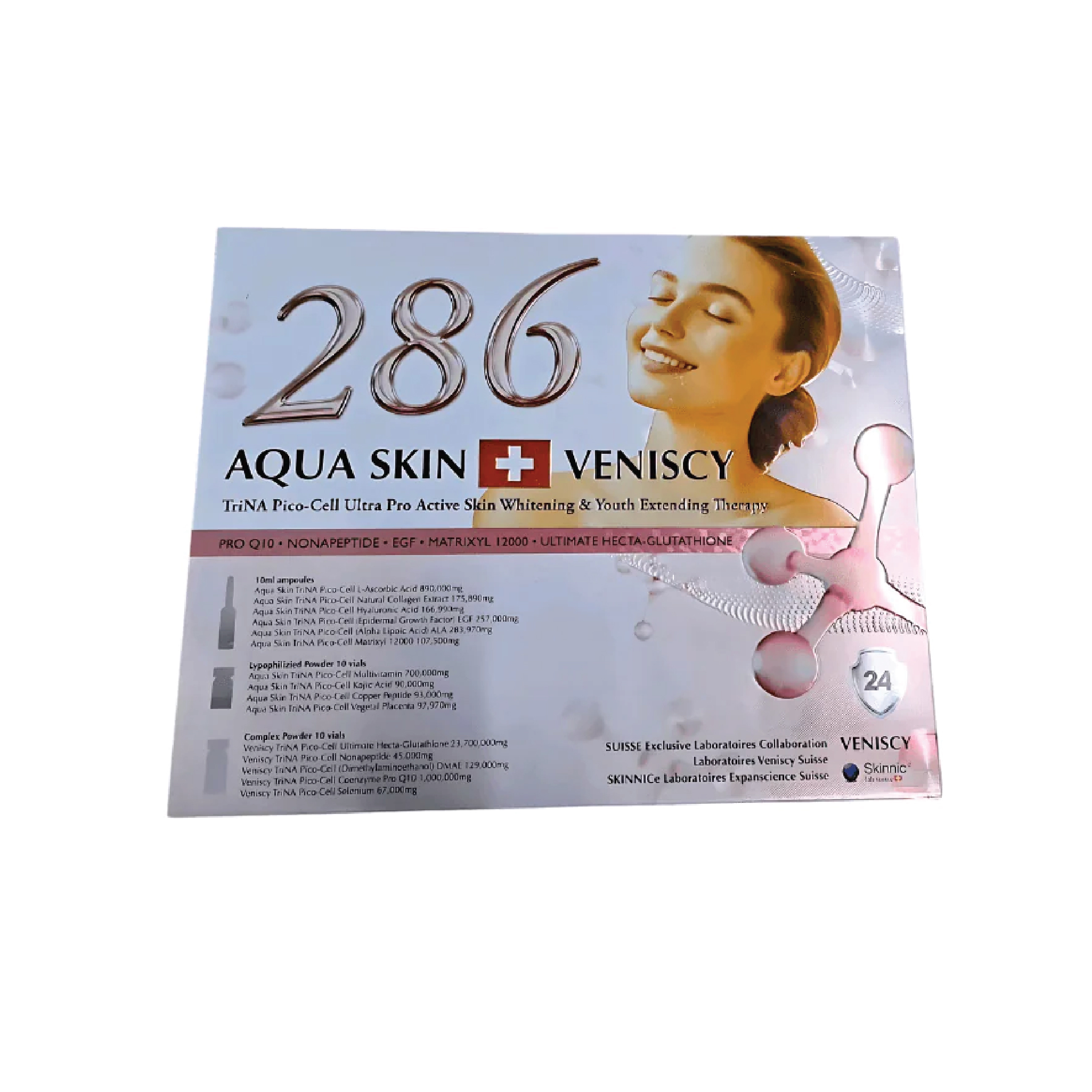 Aqua Skin Veniscy 286 TriNA Pico-Cell Ultra Pro Active Skin Whitening & Youth Extending Therapy [10 Sessions] is an advanced skin rejuvenation and whitening treatment formulated with TriNA Pico-Cell Whitening Technology, high-potency antioxidants, glutathione, vitamins, and youth-enhancing actives.