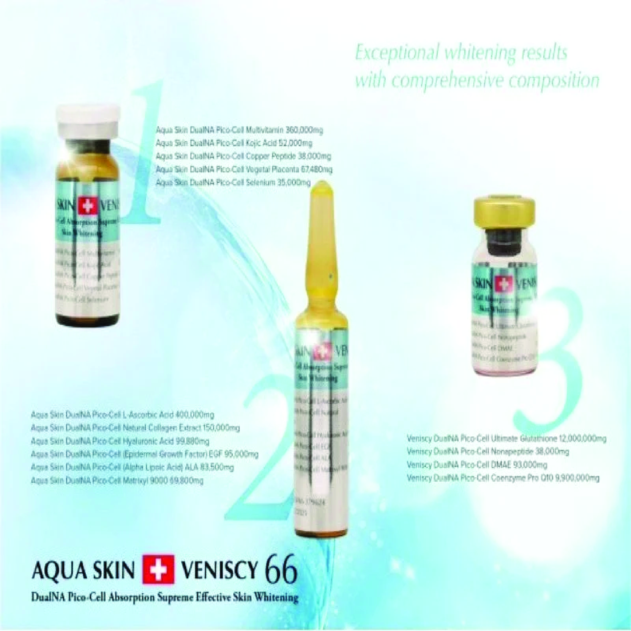• Treatment: The Aqua Skin Veniscy 66 – DualNA Pico Cell Absorption Supreme Effective Skin Whitening Injection should be used in a series of 10 Sessions for optimal results. Each injection should be spaced approximately 5-8 days apart to allow your body to absorb the full benefits.