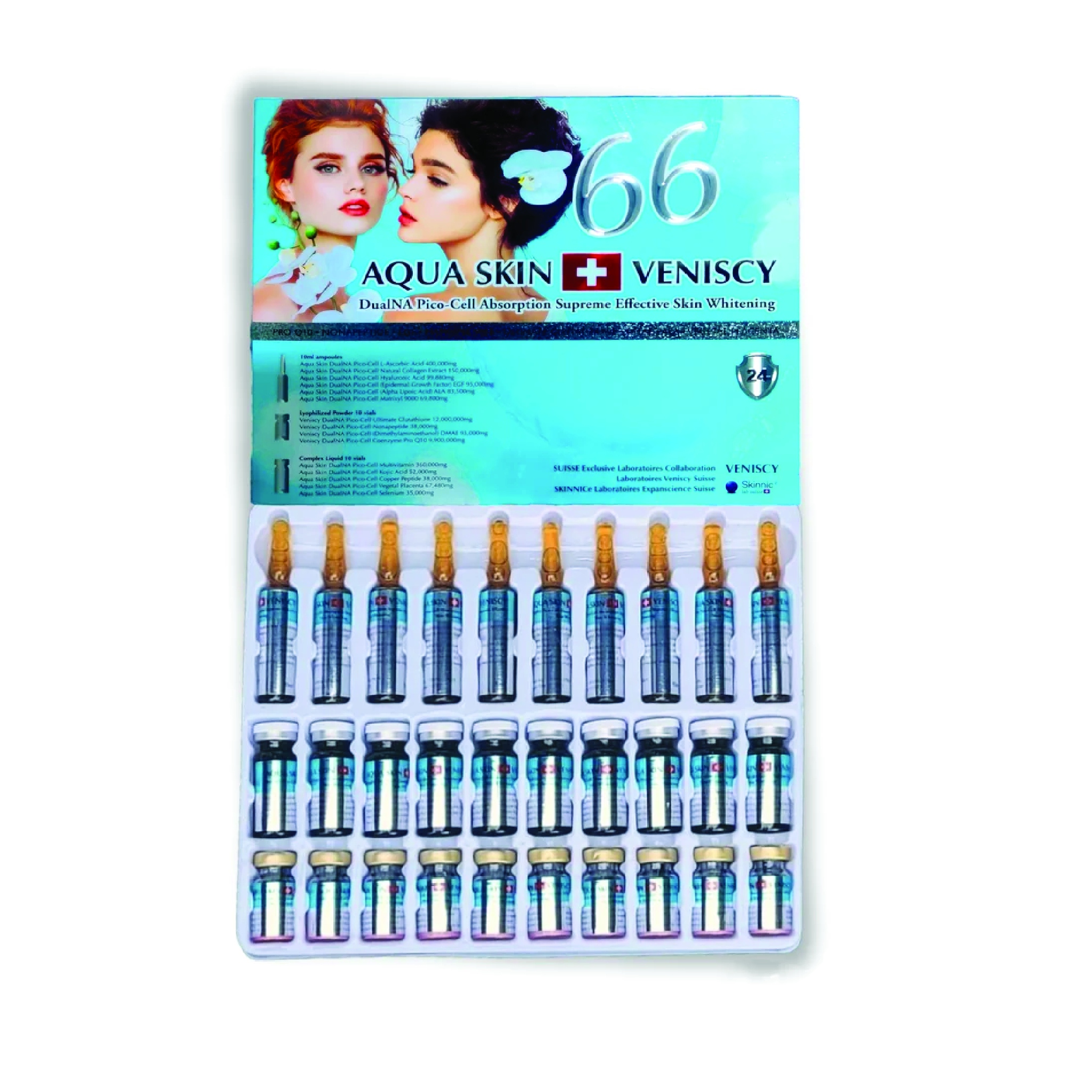Discover the ultimate solution for radiant, youthful, and flawless skin with Aqua Skin Veniscy 66 DualNA Pico Cell Absorption Supreme Effective Skin Whitening Injection [10 Sessions]. This high-performance whitening treatment combines DualNA technology with Pico Cell Absorption, delivering deep cellular penetration of Glutathione, Collagen, and Multivitamin Complexes for fast and visible results.