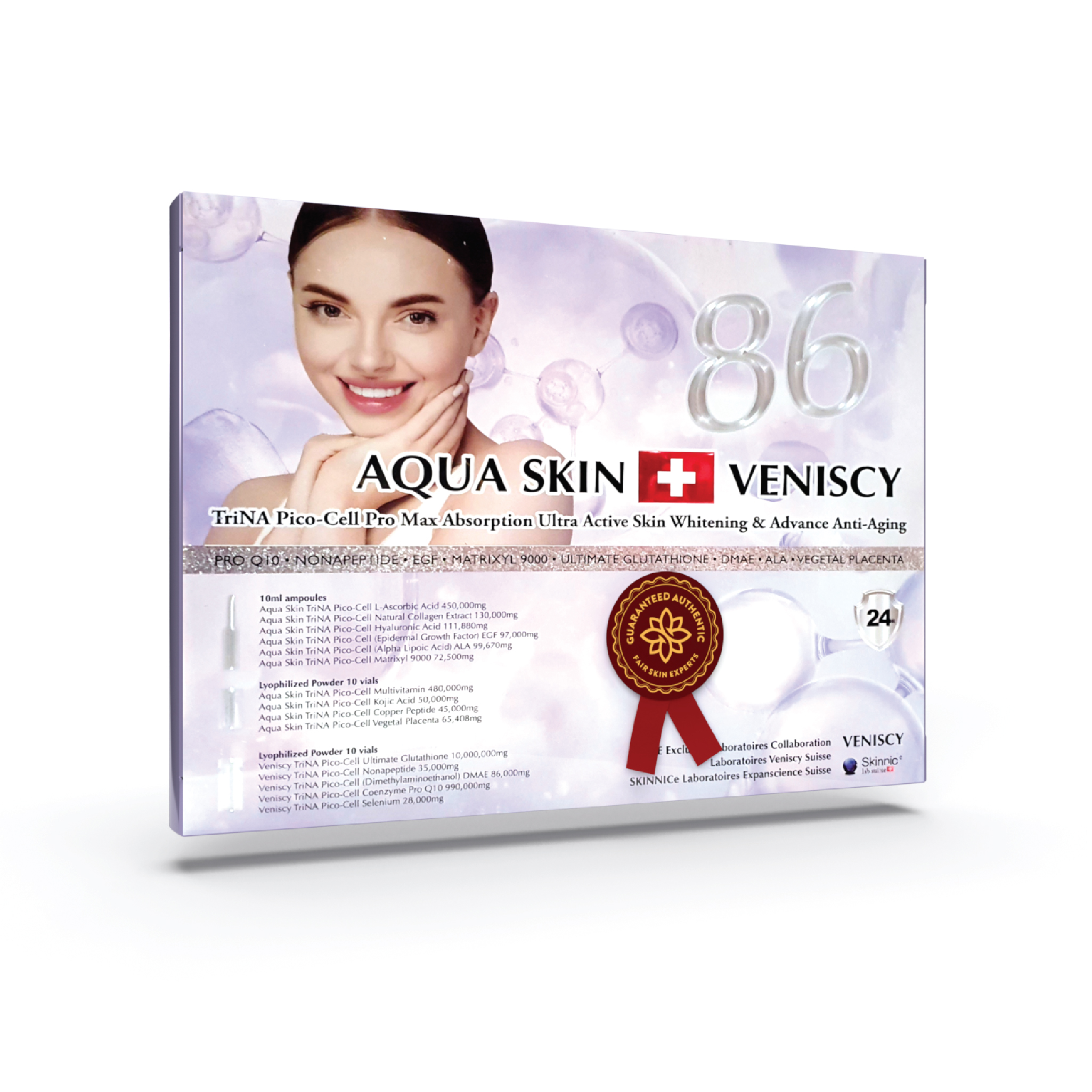 Elevate your skin’s glow with Aqua Skin Veniscy 86 TriNA Pico Cell Ultra Absorption Supreme Skin Whitening and Anti-Aging – Purple Box [10 Sessions]. This premium injectable formula combines TriNA technology with Pico Cell Ultra Absorption, delivering high-potency whitening and anti-aging nutrients directly to the deepest layers of the skin for faster and long-lasting results.