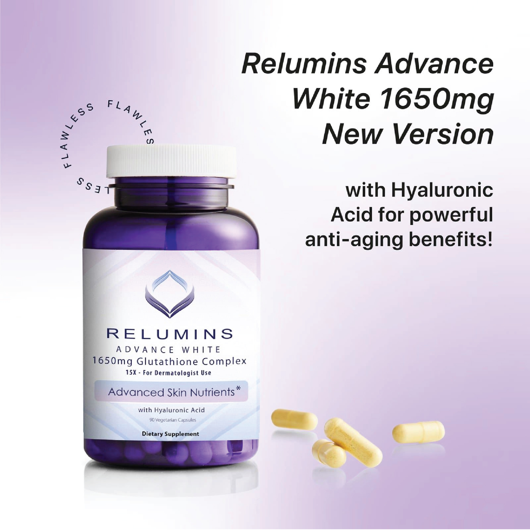 • Treatment: The Relumins Advance White 1650mg Glutathione Complex 15X Advance Skin Nutrients With Hyaluronic Acid Capsule should be used in a series of 90 Capsules for optimal results. Take 1 Capsule Twice Daily, one in the morning and one at night before meals apart to allow your body to absorb the full benefits.