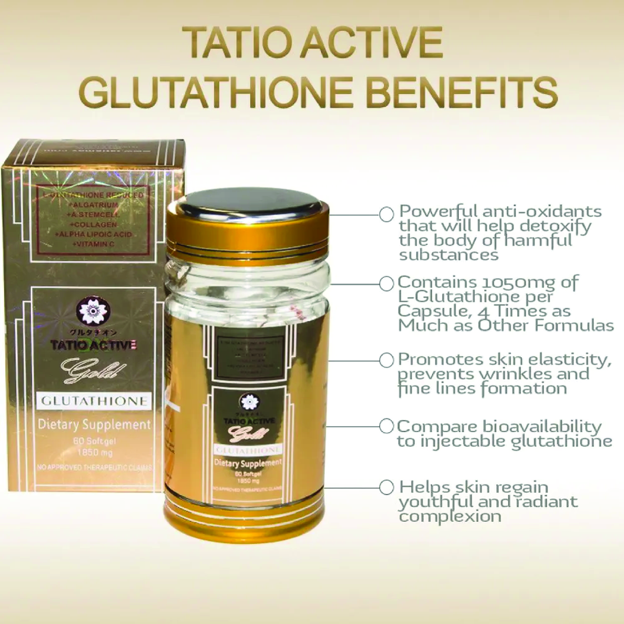 • Treatment: The Tatio Active Gold Glutathione 1850mg Skin Whitening Softgel should be used in a series of 60 Capsules for optimal results. Take 1 Capsule Twice Daily, one in the morning and one at night before meals apart to allow your body to absorb the full benefits.