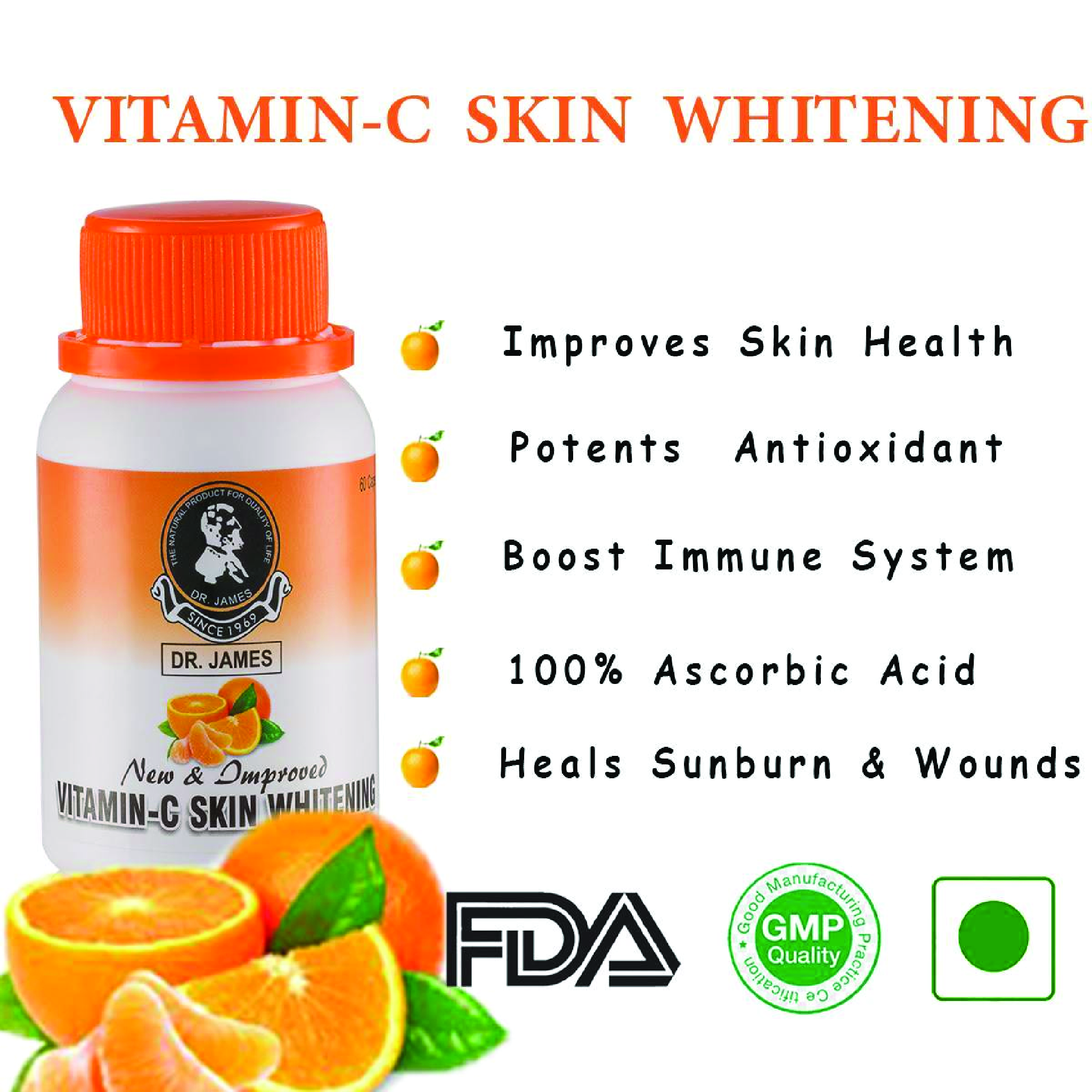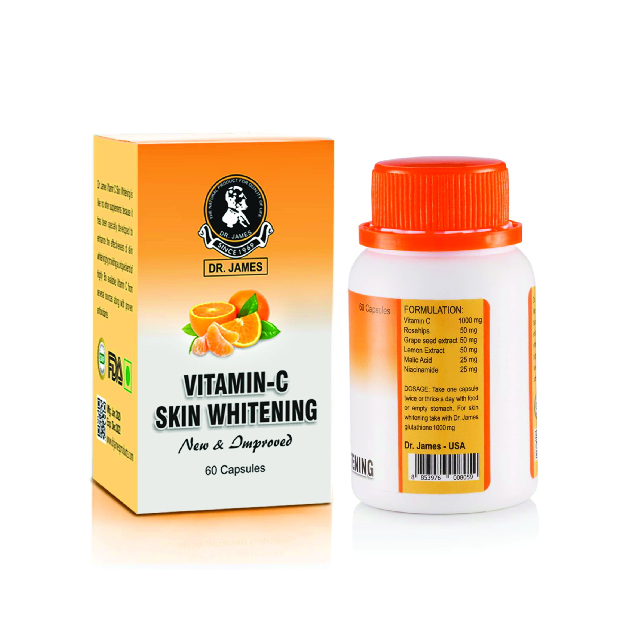 • Treatment: The Dr James Vitamin C Skin Whitening Capsule should be used in a series of 60 Capsules for optimal results. Take 1 Capsule Twice Daily, one in the morning and one at night before meals apart to allow your body to absorb the full benefits.